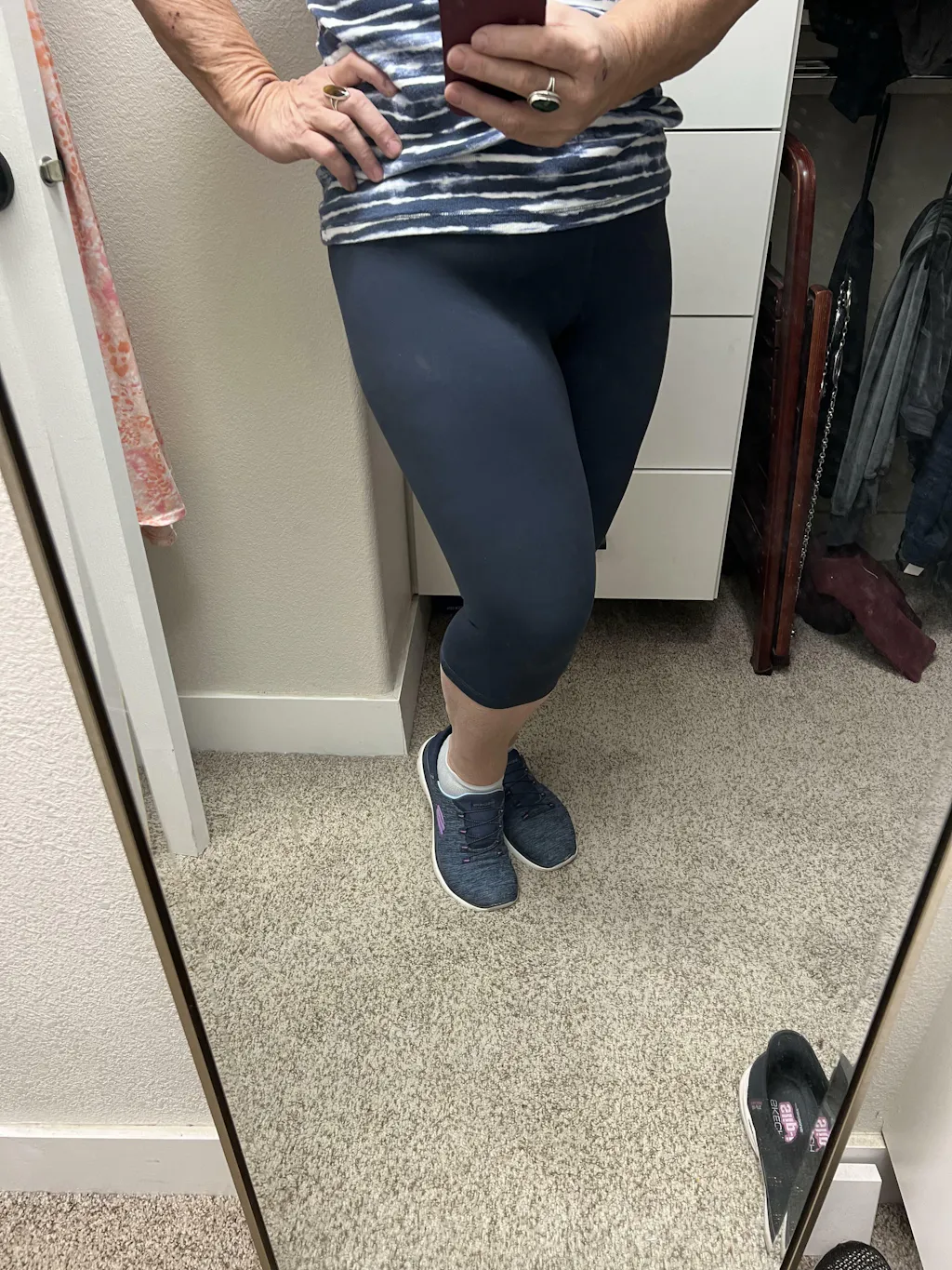 "I love these leggings! They feel so nice + the stretch and form is amazing. I did size up from an XS to a S because I am pregnant, however I don’t think I needed to size up. It may be helpful for third tri but I think either way would be fine. Hopefully that helps someone:)"